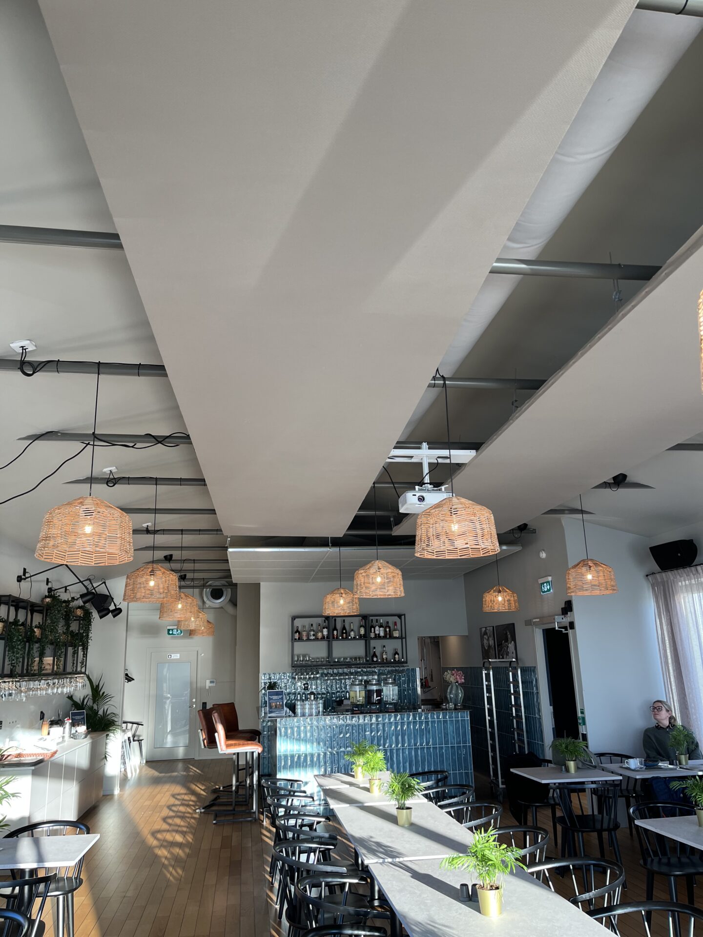 När Bryggans Bistro i Västerås i takt med ökad efterfrågan började använda sin eventlokal på andra våningen allt oftare, uppstod ett tydligt problem: ljudnivån blev snabbt så hög att både gäster och personal upplevde rummet som stressigt, svårarbetat och tröttande. Ekon från hårda ytor och brist på ljudabsorption gjorde att talförståelsen försämrades – ett stort hinder för företagsevent, privata middagar och musikarrangemang.